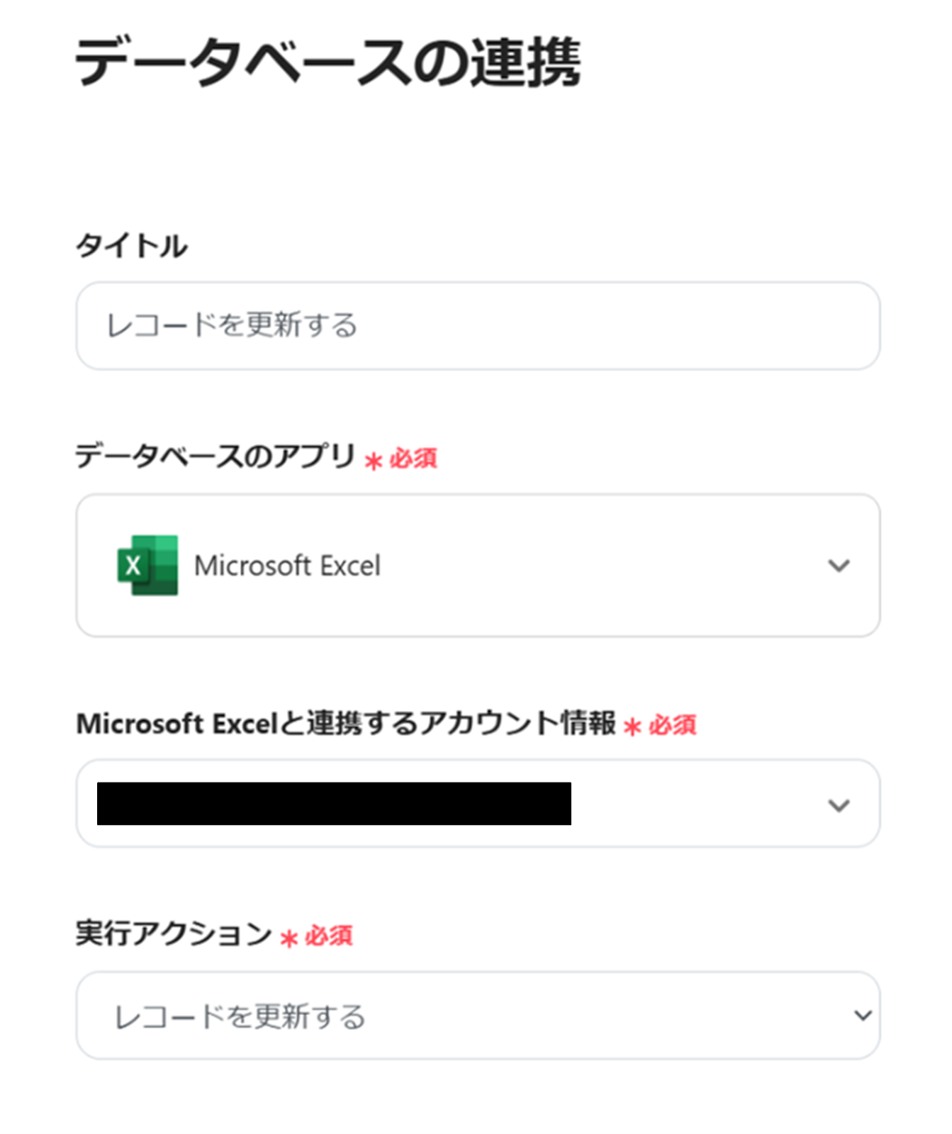 (2)Microsoft Excelの「データベースの連携」画面から、Microsoft Excelと連携するアカウント情報に誤りがないかを確認し、実行アクションは「レコードを更新する」のままにします。