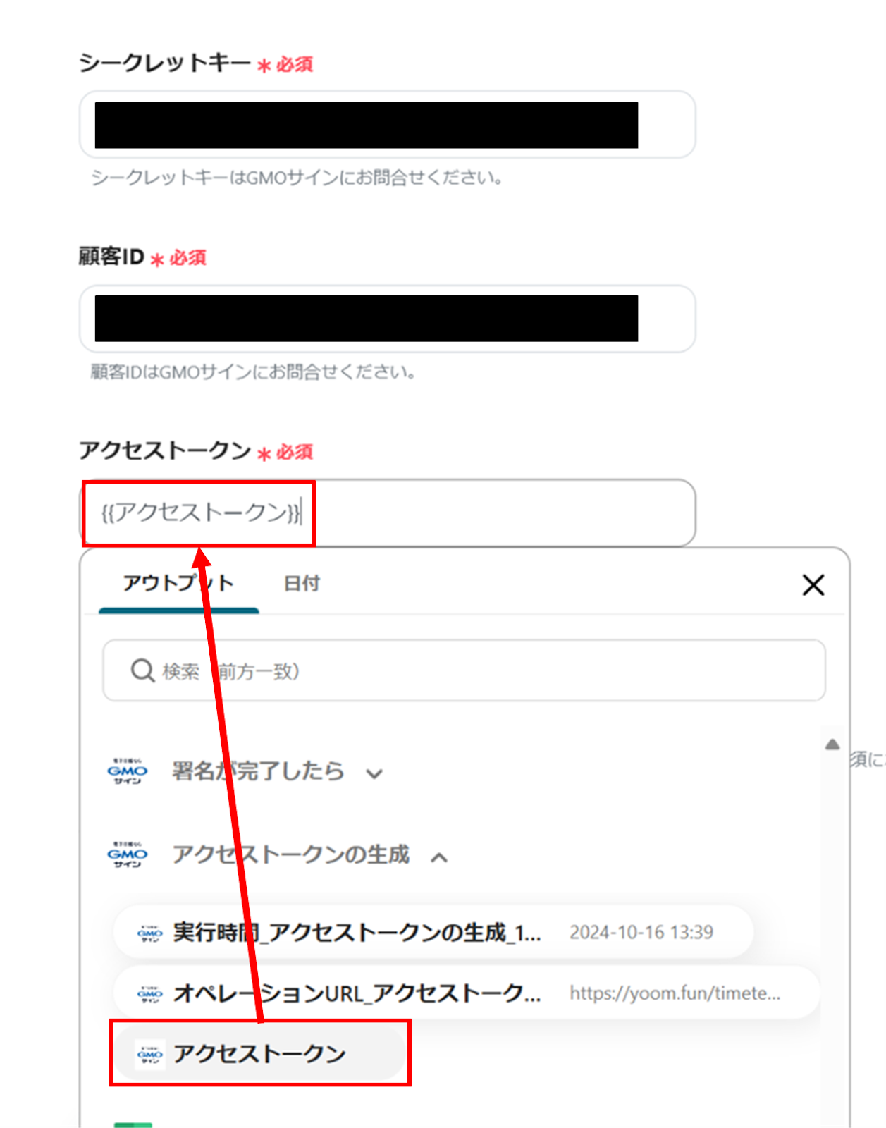アクセストークンとトランザクションIDはアウトプットから選択してください。