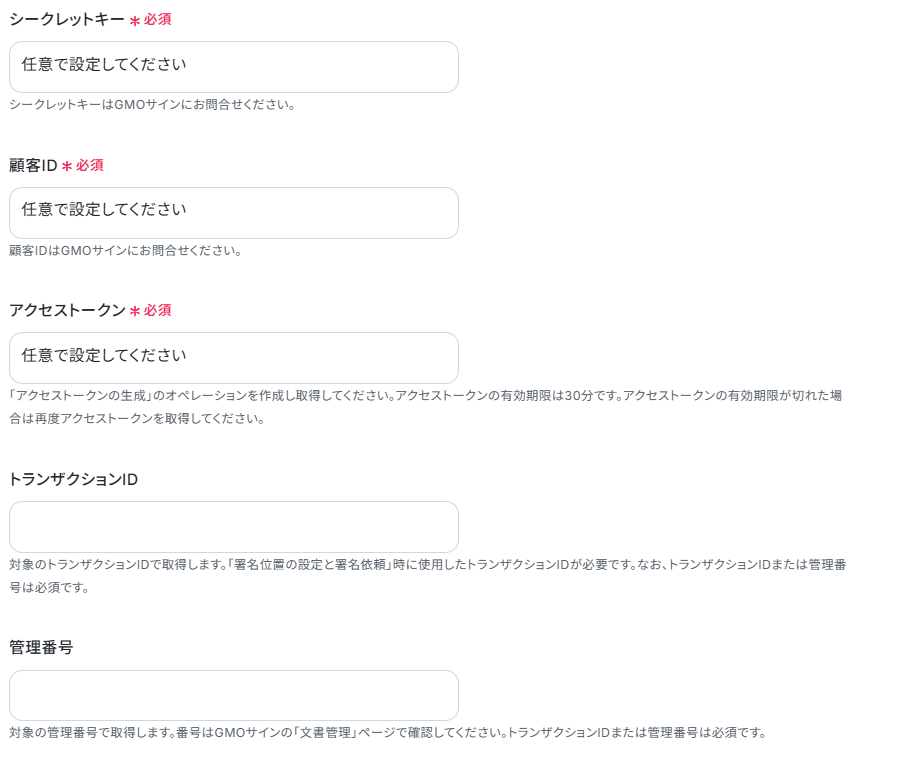 「シークレットキー」、「顧客ID」、「アクセストークン」→任意で設定