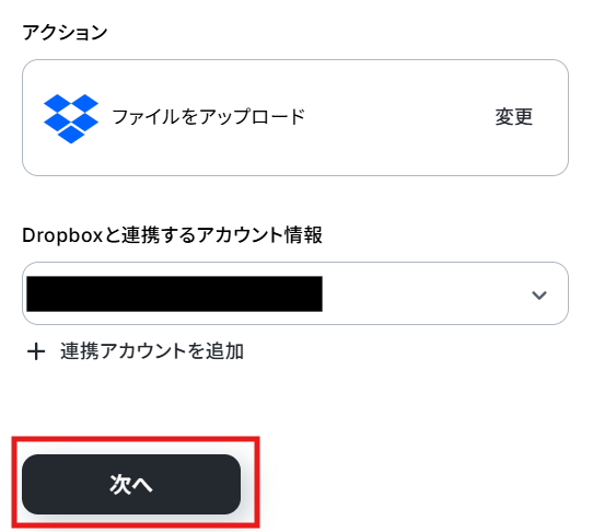 次にDropboxにファイルをアップロードする設定を行うので、「ファイルをアップロード」をクリックしましょう。