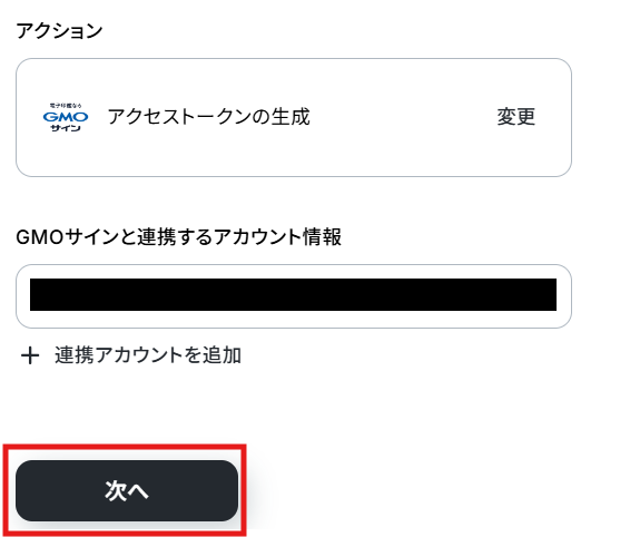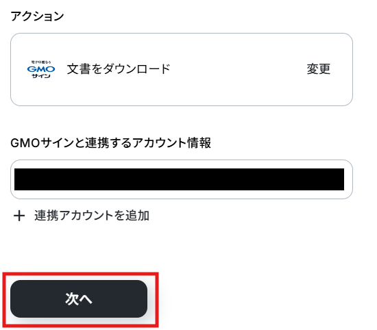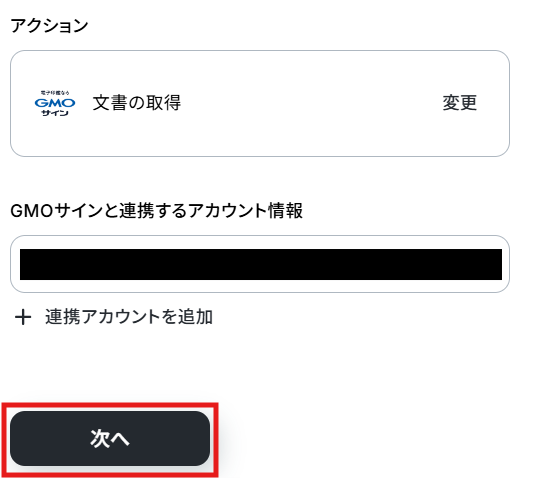 次にGMOサインで指定された文書のダウンロードURLを取得する設定を行うので、「文書の取得」をクリックしましょう。