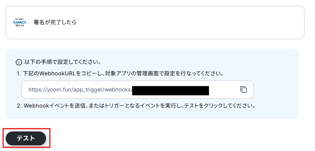 設定後、Webhookイベントを送信、またはトリガーとなるイベントを実行して、「テスト」→「テスト成功」→「完了」をクリックしましょう。