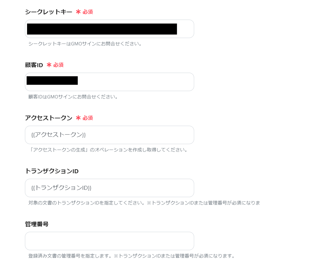 アクセストークンとトランザクションIDは先に連携した内容のため、候補から選択できます。
