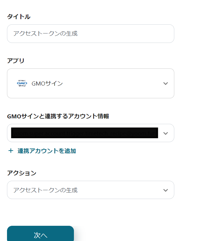 8)アクションは「アクセストークンの生成」を選択し、「次へ」をクリックします。