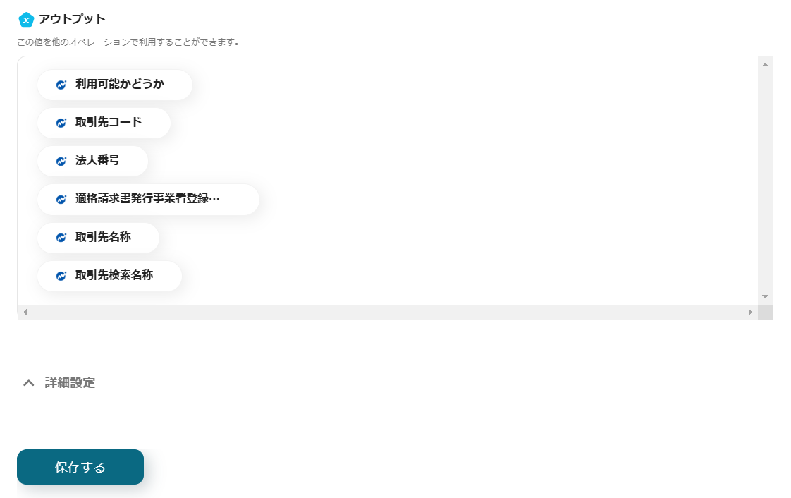 ※マネーフォワード クラウド会計に登録したい項目がアウトプットに表示されていない場合は、JSON PATHにより取得することも可能です。方法は、こちらのヘルプページで解説しています。