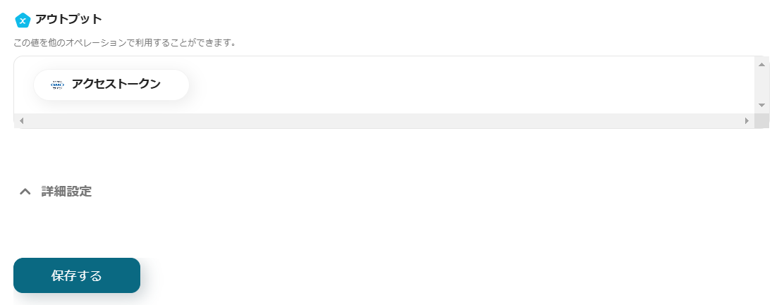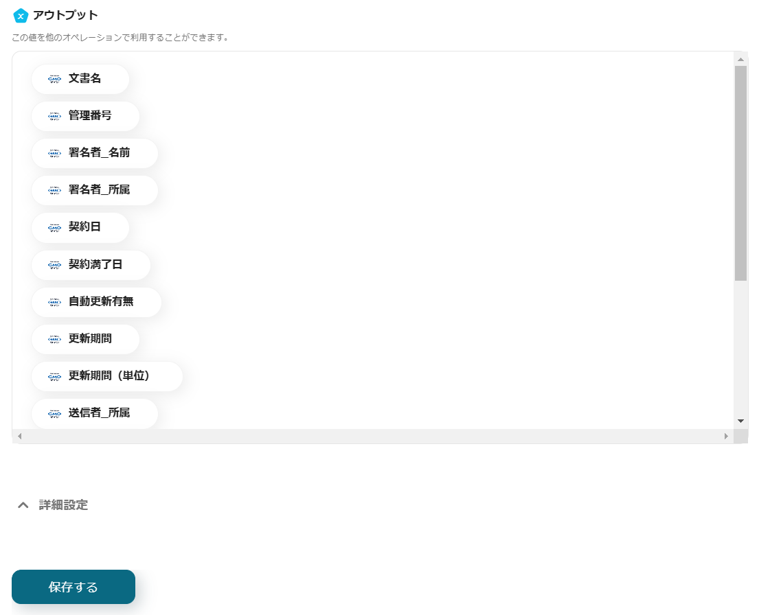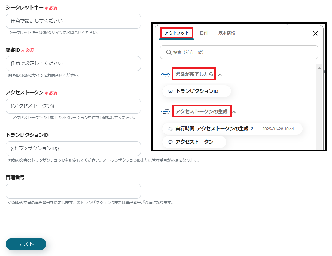 ※アクセストークンとトランザクションIDは、枠をクリックして表示されるアウトプットの「アクセストークンの生成」と「署名が完了したら」から設定します。(値は二重括弧で表示されます)これにより、契約ごとに変わる値を動的に反映できます。