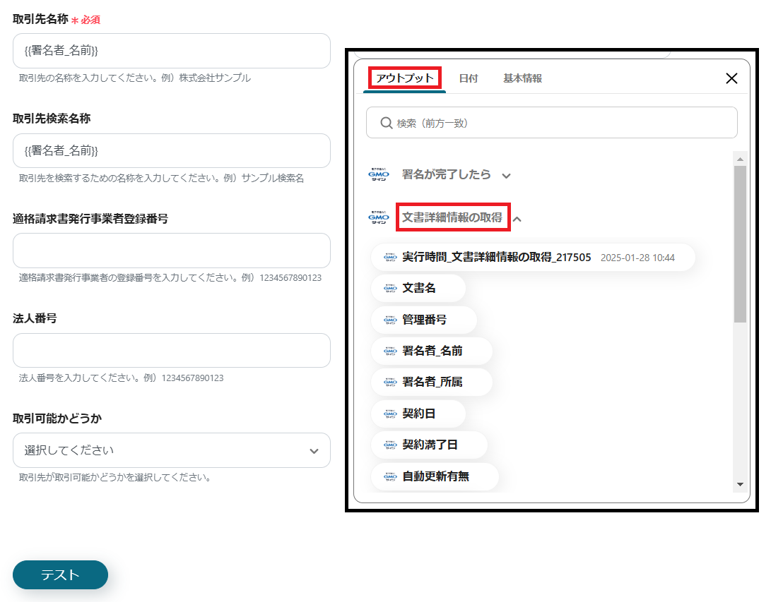 ※GMOサインから取得した情報を反映させる場合は、枠をクリックして表示されるアウトプットの「文書詳細情報の取得」から設定します。(値は二重括弧で表示されます)これにより、書類ごとに変わる取引先情報を動的に反映できます。