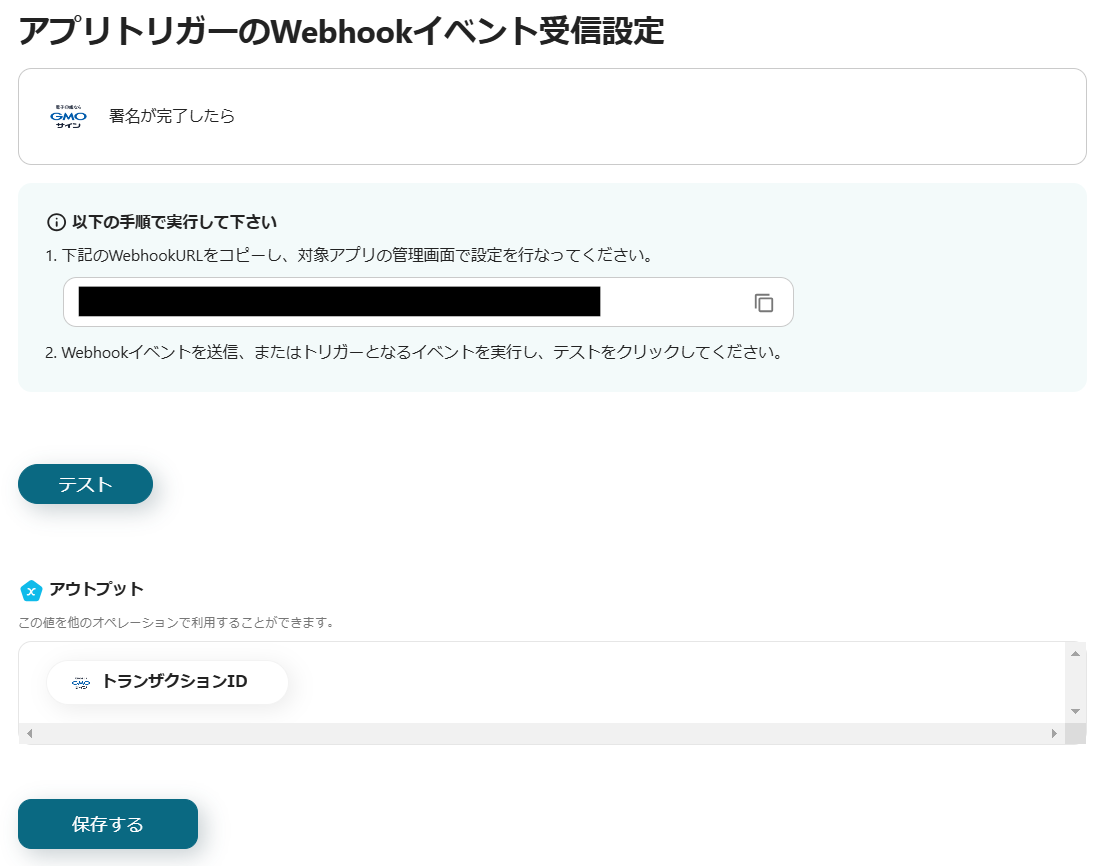 4.WebhookURLをコピーしてGMOサインに設定し、GMOサインで締結が完了したらテストを行います。