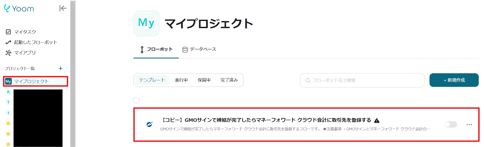 1.Yoom管理画面の「マイプロジェクト」を選択し、「【コピー】GMOサインで締結が完了したらマネーフォワード クラウド会計に取引先を登録する」をクリックします。