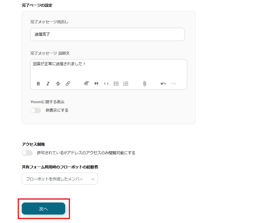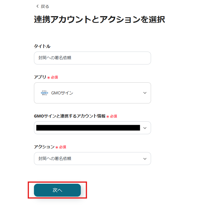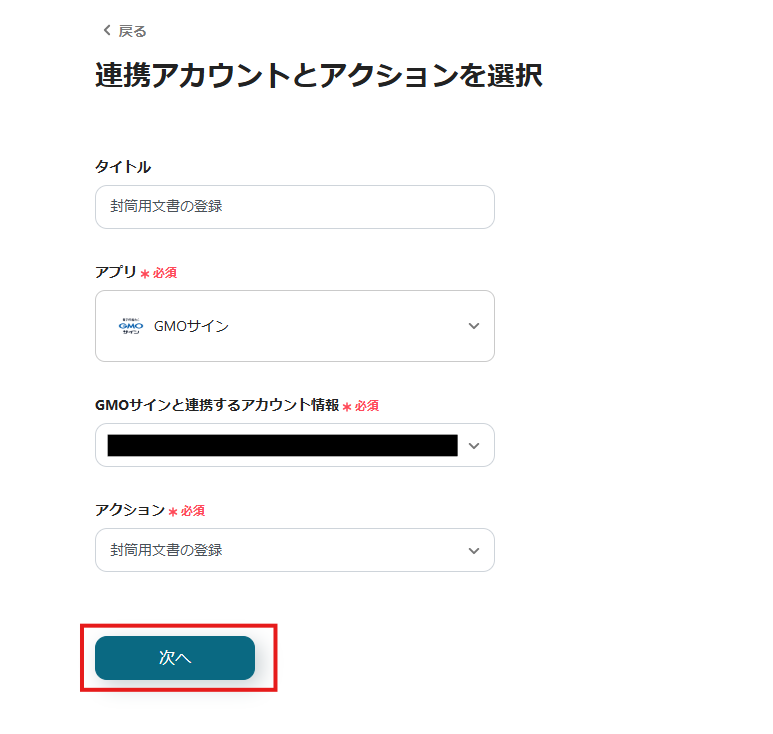 表示された画面で必須項目を入力し、「次へ」をクリックします。