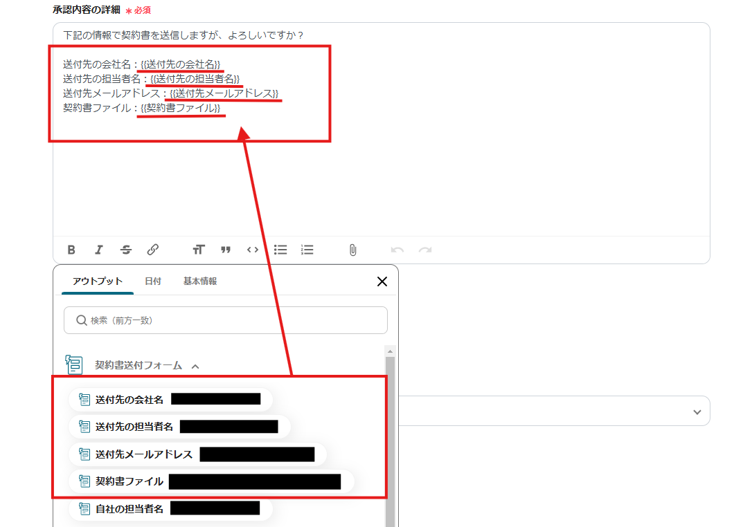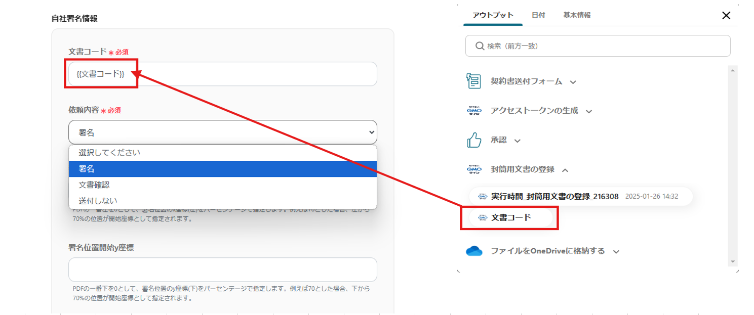「送信先署名者:名前」「送信先署名者:メールアドレス」は、入力欄をクリックして表示されるアウトプットから選択してください。