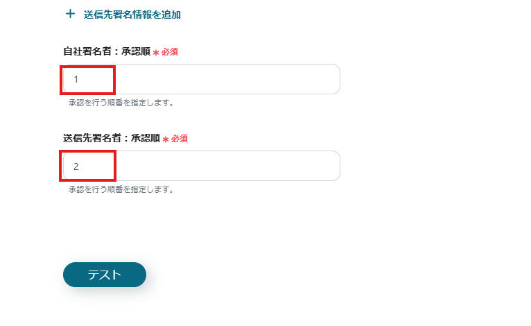「自社署名者:承認順」「送信先署名者:承認順」を入力してください。
