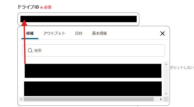 「ドライブID」は、入力欄をクリックして表示される候補から選択してください。