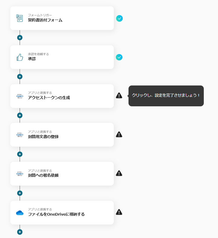 ※こちらの画面は、Yoomページ画面左側「マイプロジェクト」のフローボットで表示される、「【コピー】フォームに回答されたら契約書類を用いてGMOサインを送付し、その書類をOneDriveにも格納する」をクリックすると表示されます。