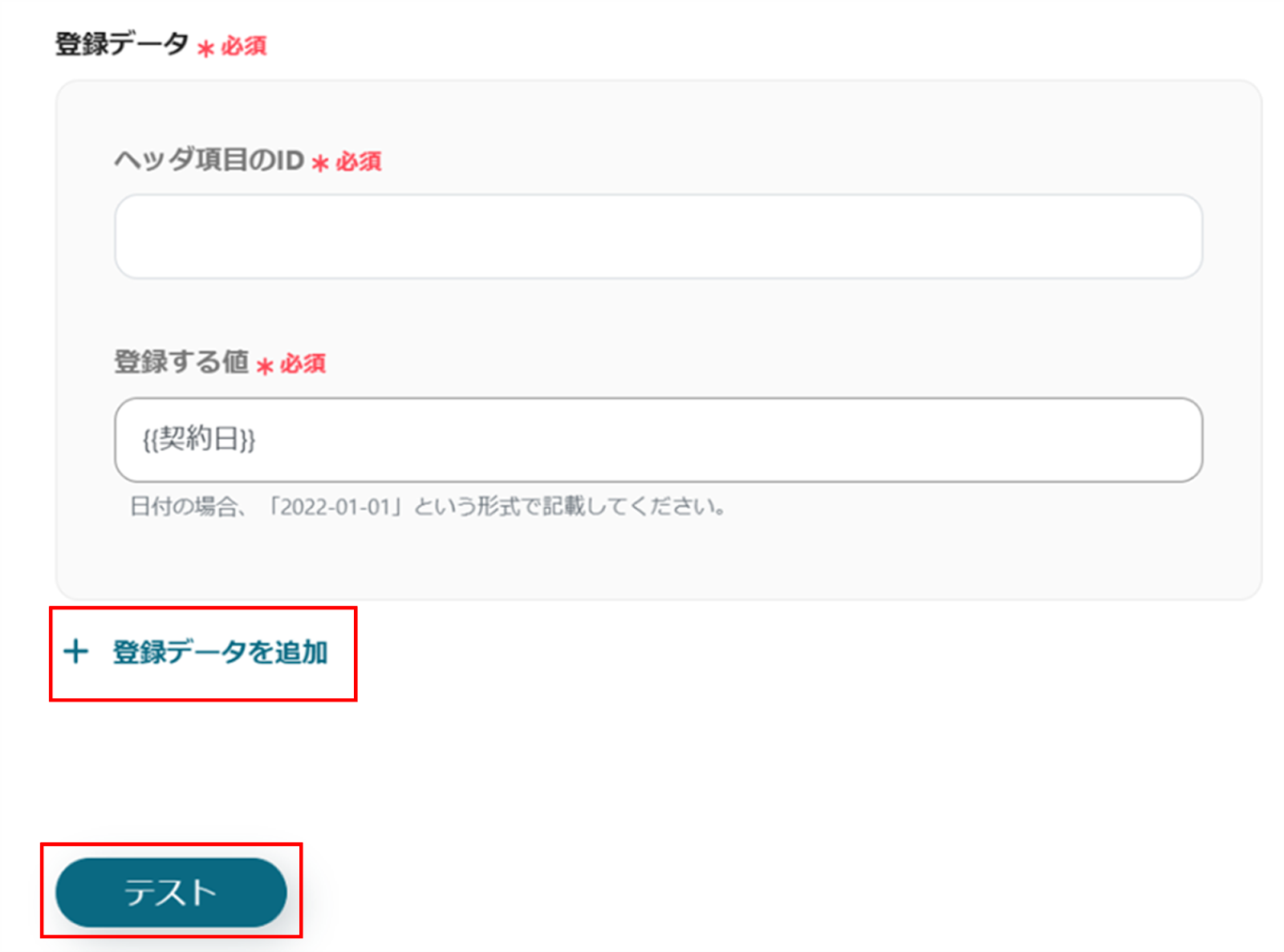 下へ進み、ヘッダ項目のID、登録する値を入力します。他にも登録データを追加したい場合は「+登録データを追加」をクリックすることで、新しい入力ボックスが作成されます。