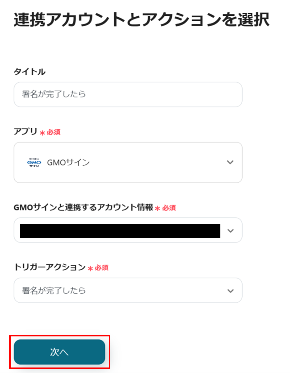 (2)GMOサインの「連携アカウントとアクションを選択」画面から、GMOサインと連携するアカウント情報に誤りがないかを確認し、トリガーアクションは「署名が完了したら」のままで「次へ」をクリックします。