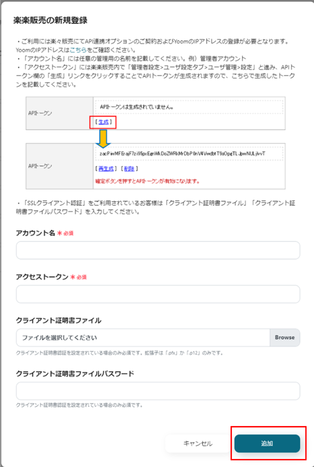 (5)「楽楽販売の新規登録」画面から、アカウント名、アクセストークンを入力します。