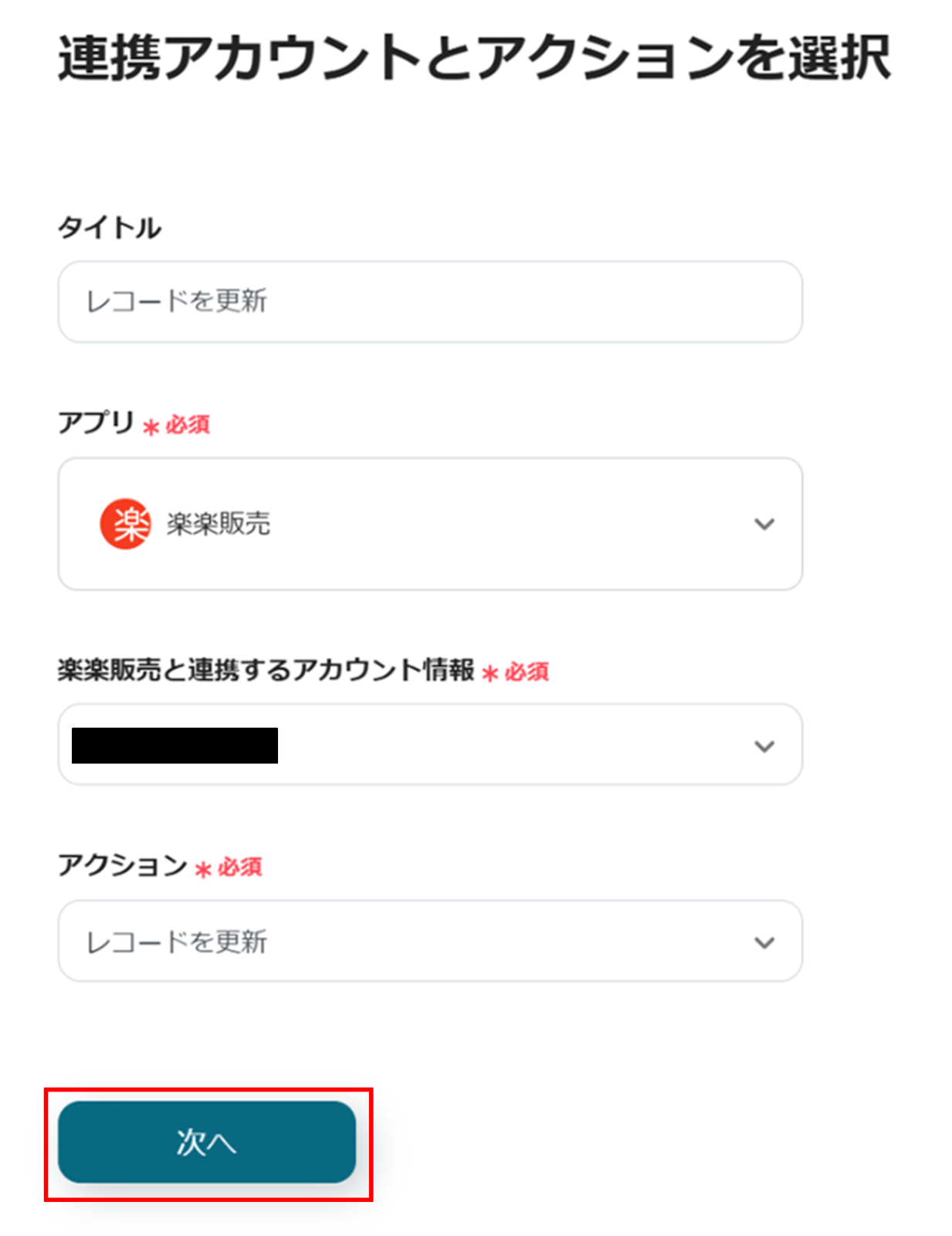 (2)楽楽販売の「連携アカウントとアクションを選択」画面から、楽楽販売と連携するアカウント情報に誤りがないかを確認し、アクションは「レコードを更新」のままで「次へ」をクリックします。