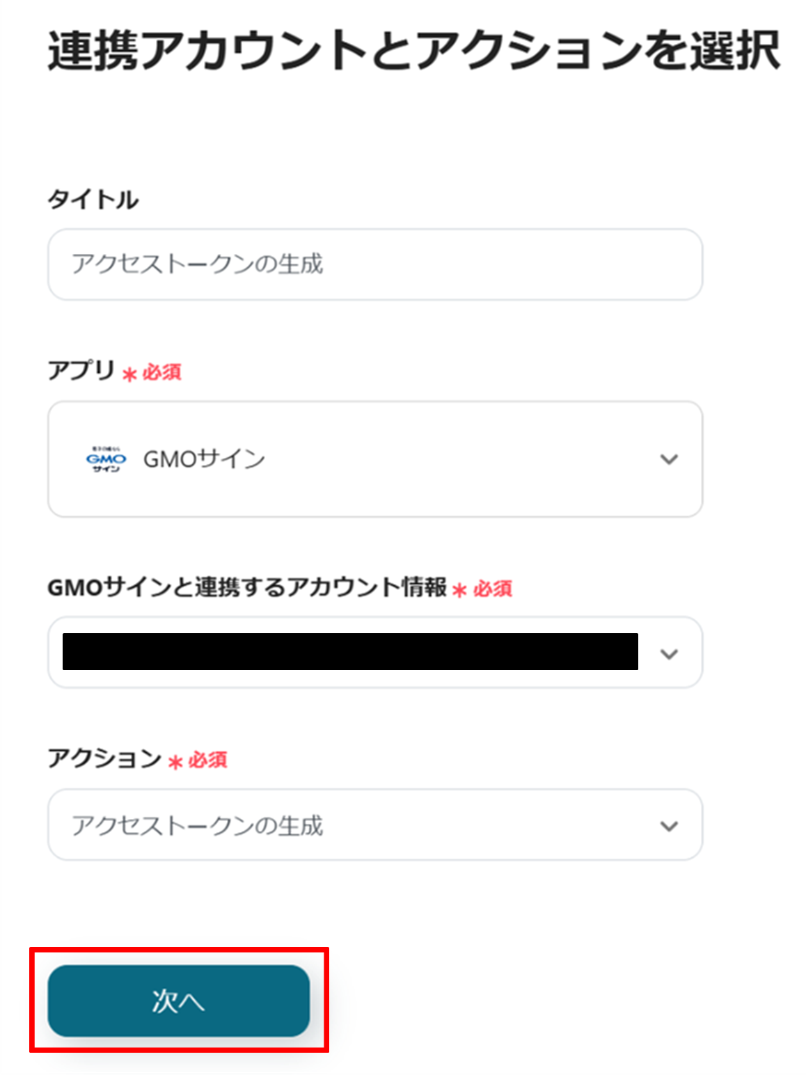 (2)「連携アカウントとアクションを選択」画面から、GMOサインと連携するアカウント情報に誤りがないかを確認し、アクションは「アクセストークンの生成」のままで「次へ」をクリックします。