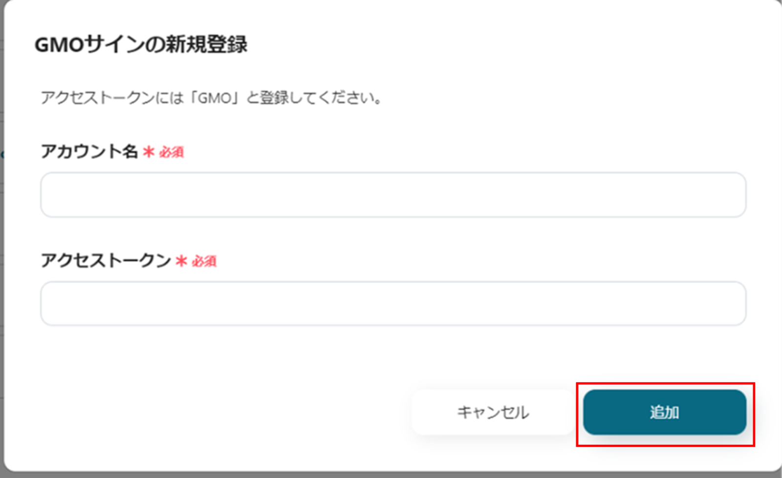 (3)「GMOサインの新規登録」画面から、アカウント名、アクセストークンを入力します。