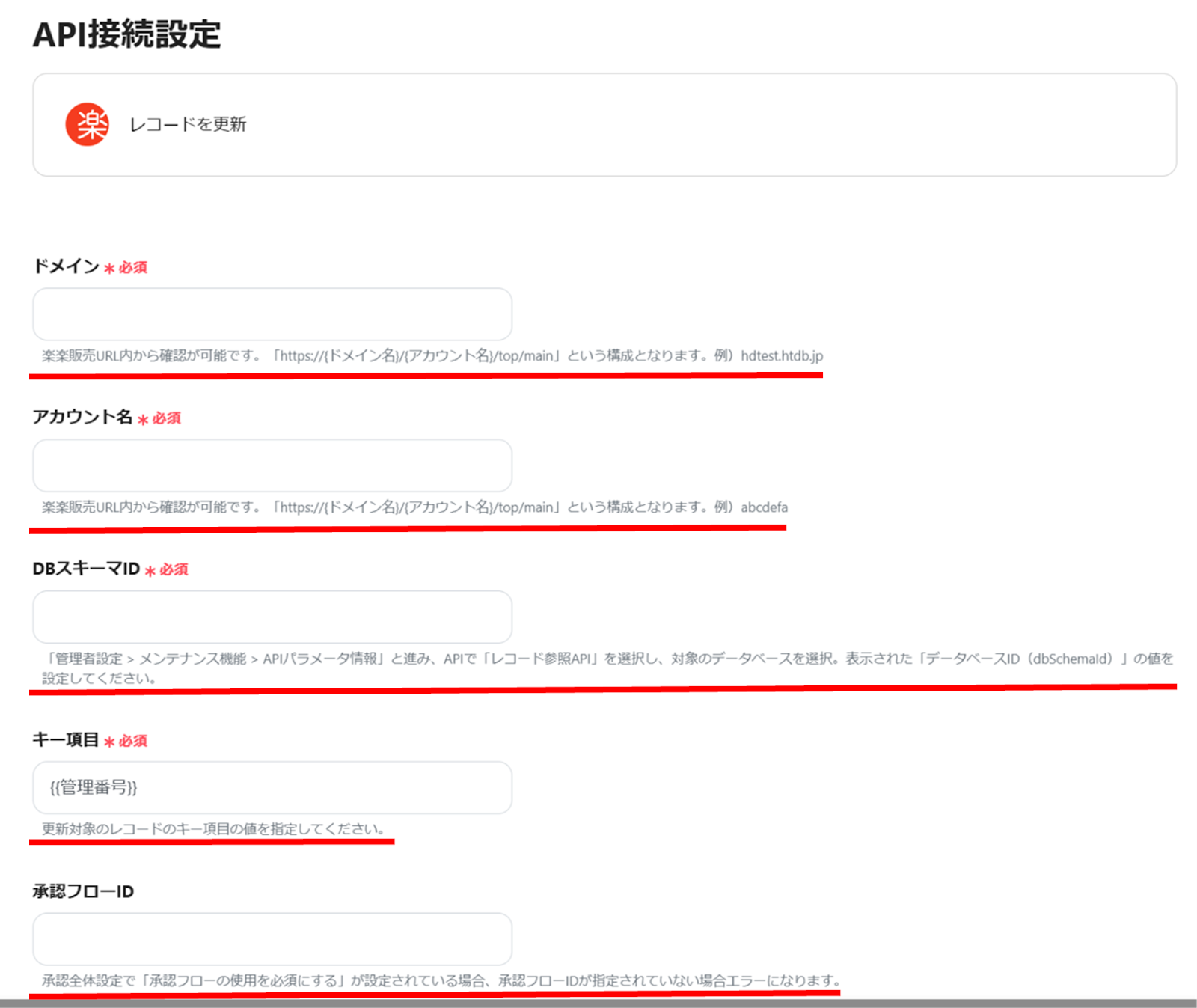 (3)「API接続設定」画面から、赤線を確認の上、ドメイン、アカウント名、DBスキーマID、キー項目を承認フローIDを入力します。
