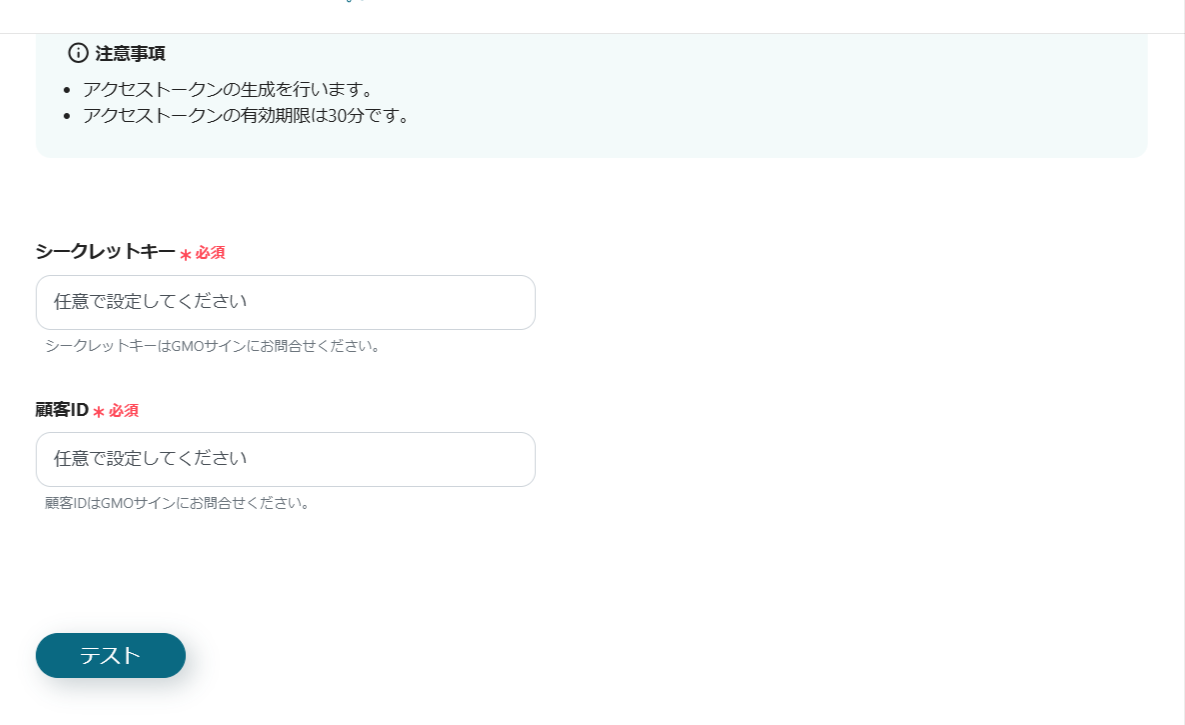 アクセストークンのアウトプットは反映されているはずなので、先ほどの設定で入力したシークレットキーと顧客IDを再度入力して「テスト」をクリックして下さい。