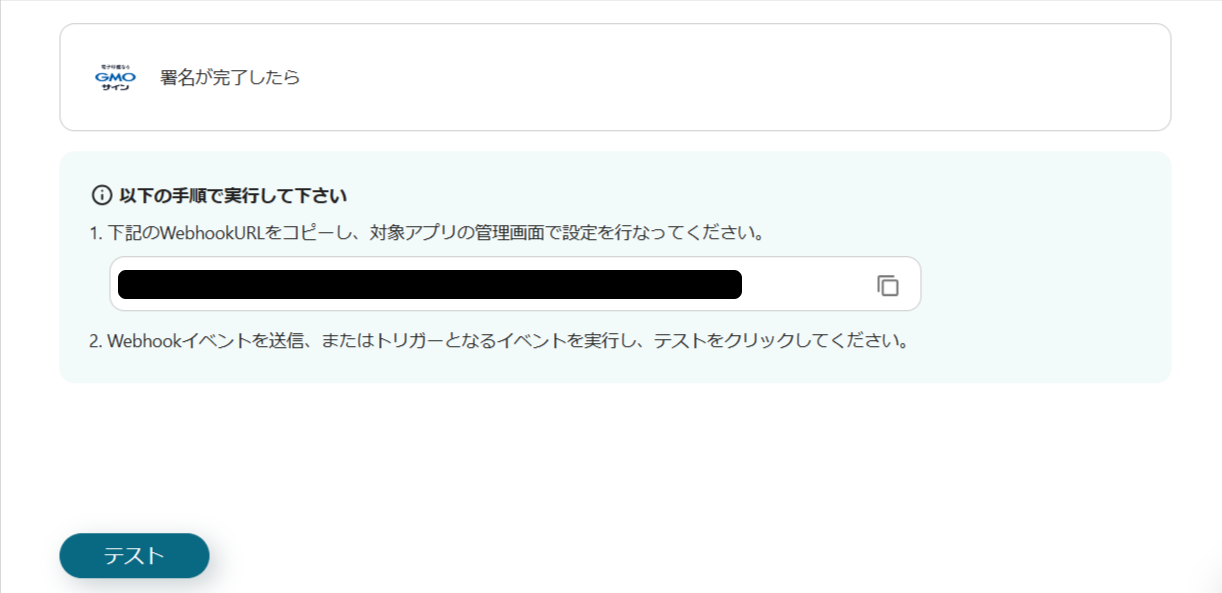 URLをコピーして、テスト用に仮で署名を完了させてから「テスト」をクリックしてください。