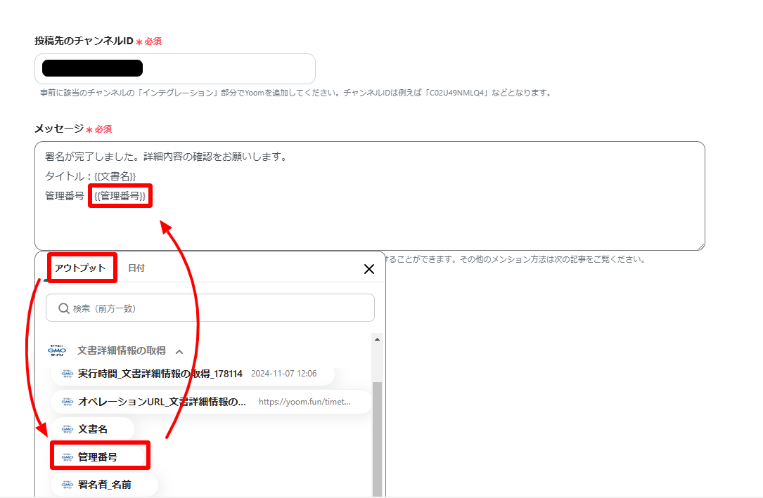 投稿先のチャンネルIDは候補から選択し、メッセージ内容はアウトプットを活用して入力してください。