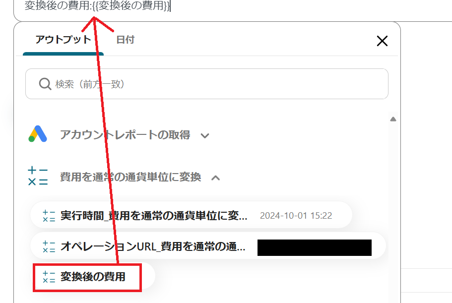 メッセージ内容は、以下のようにアウトプットから選択してください。