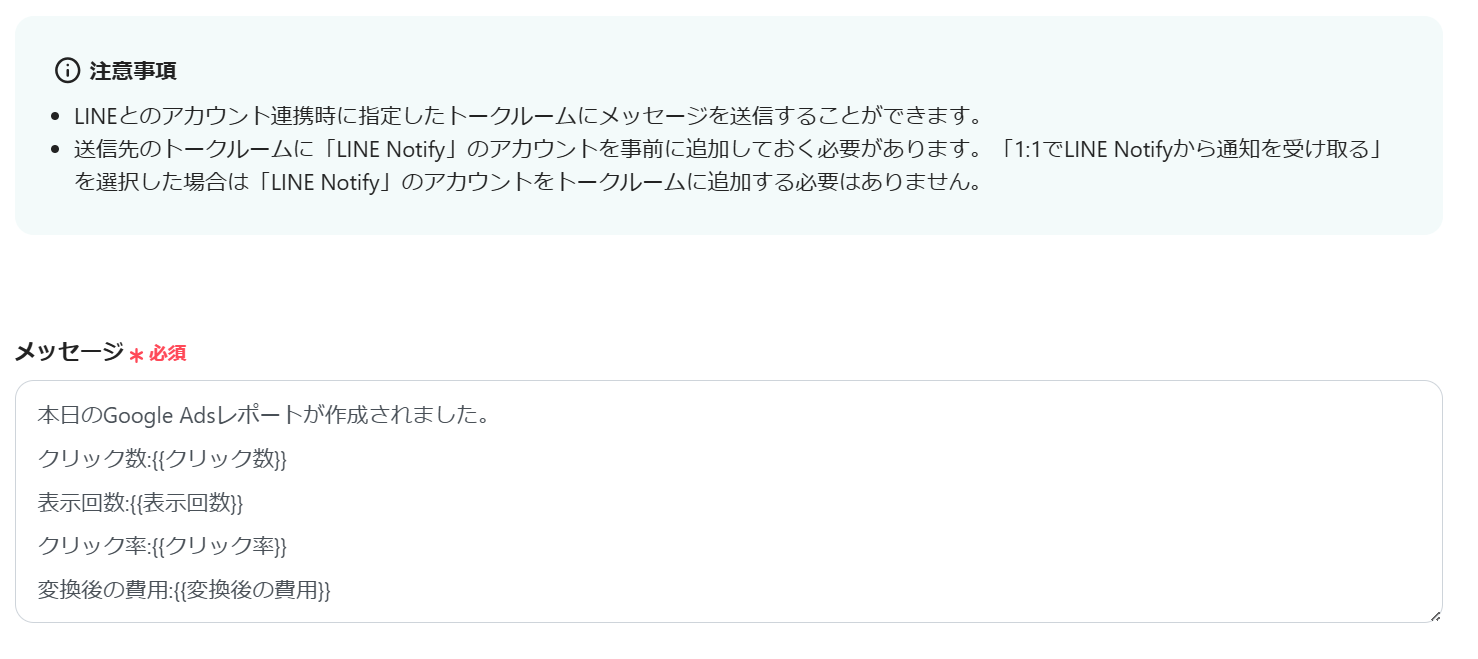 ですが、自動でGoogle AdsのレポートがLINEに通知される設定をすることで、広告パフォーマンスの変動や異常な数値に気付けるため、必要に応じて適切な対応が可能になります。