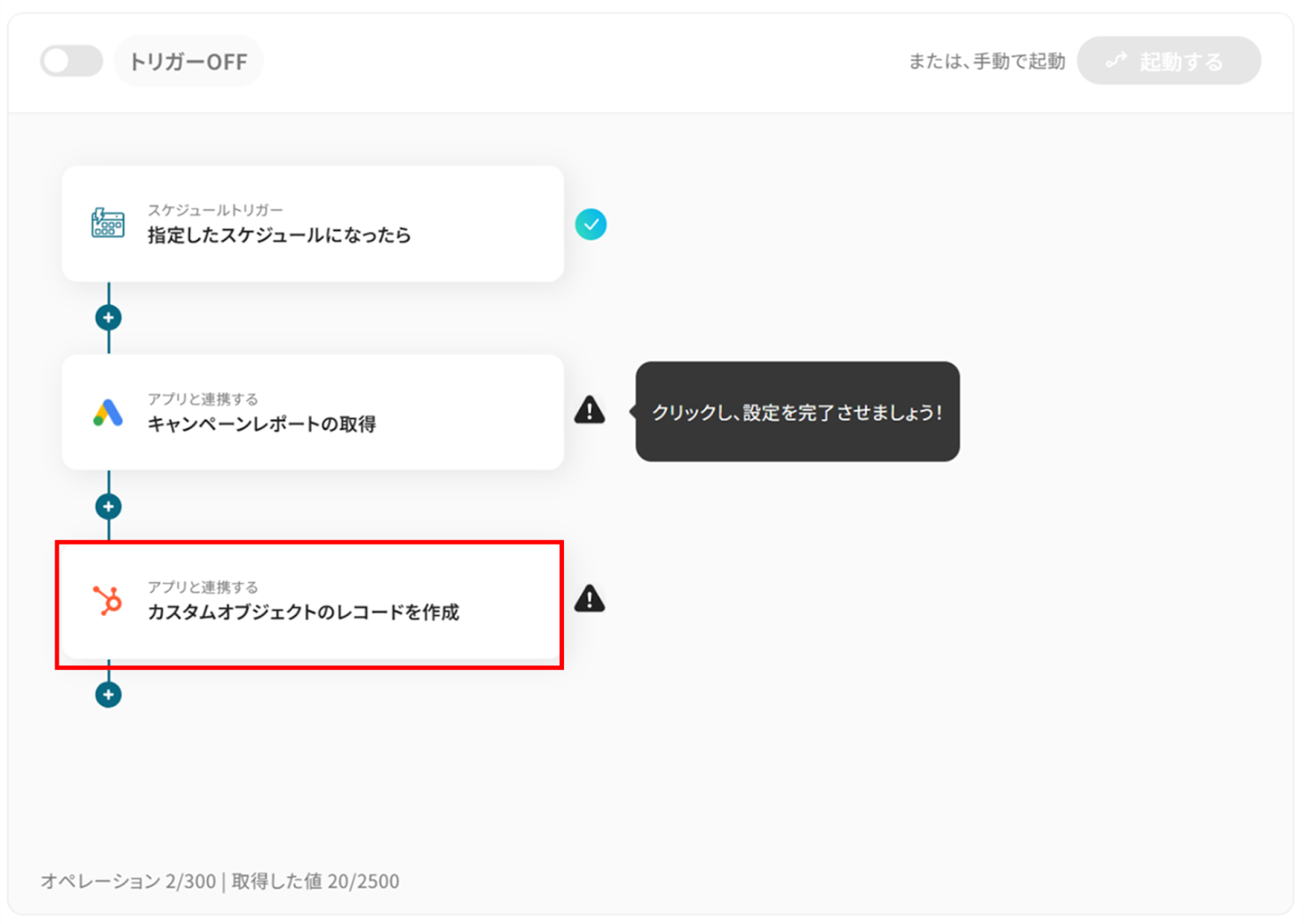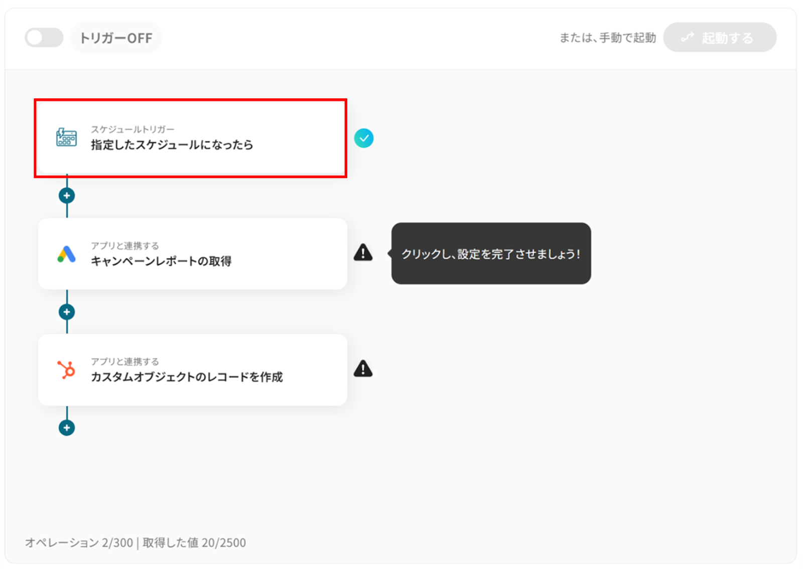 指定のスケジュールになったらGoogle Adsのキャンペーンレポートを取得し、HubSpotのカスタムオブジェクトにレコードを追加する