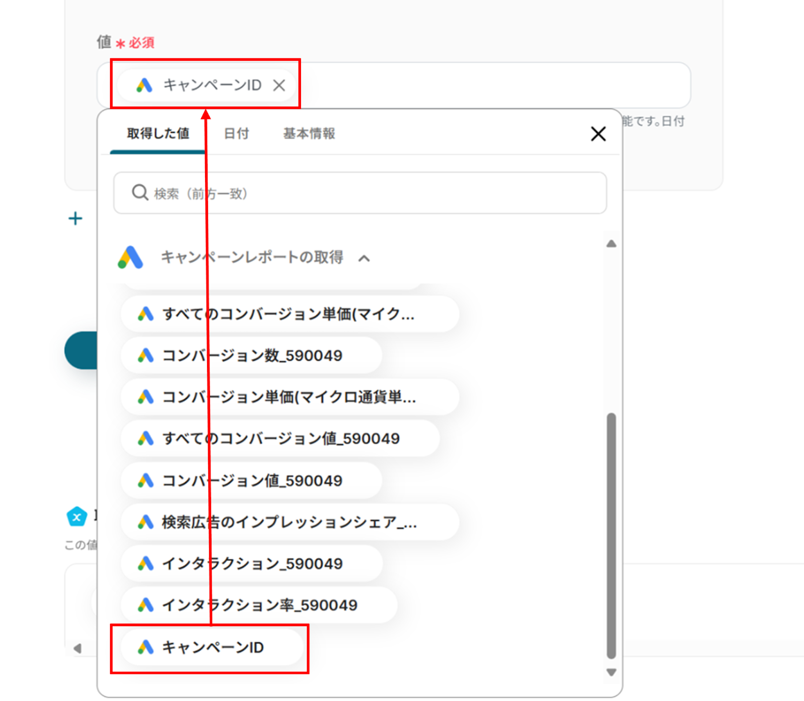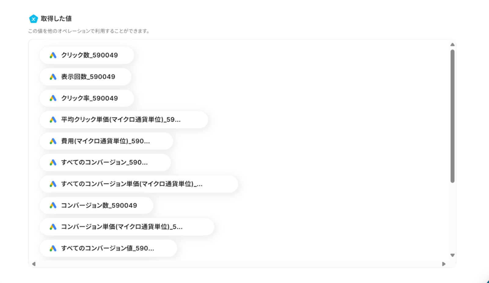 「取得した値」を使うことで、Google Adsの情報を引用できます!