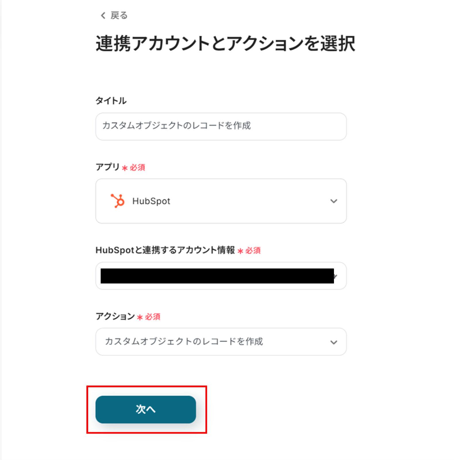 (2)HubSpotの「連携アカウントとアクションを選択」画面から、HubSpotと連携するアカウント情報に誤りがないかを確認し、アクションは「カスタムオブジェクトのレコードを作成」のままで「次へ」をクリックします。