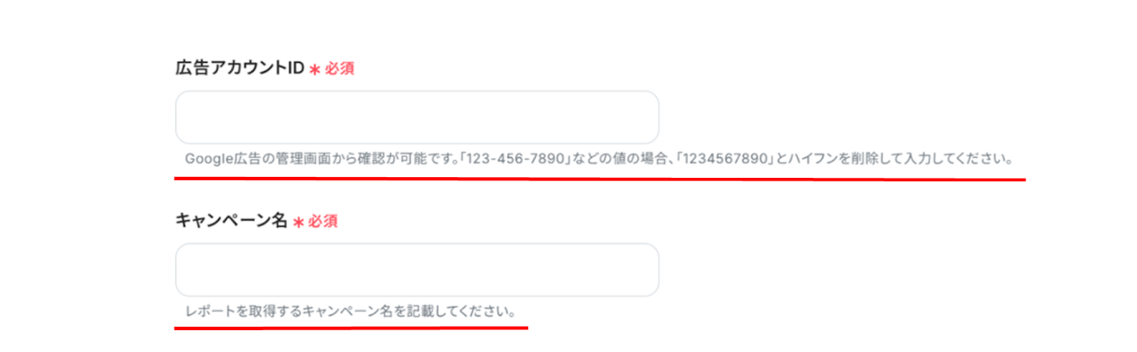 (3)「API接続設定」画面から、赤線を確認の上、広告アカウントID、キャンペーン名を入力します。