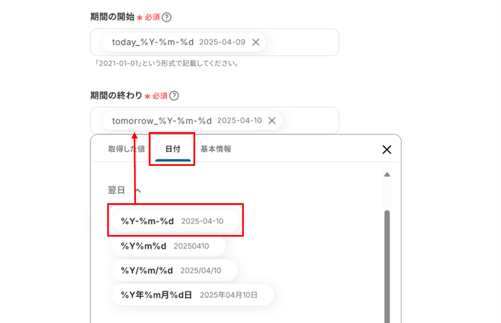 下へ進み、「期間の開始」「期間の終わり」を日付を使って入力します。