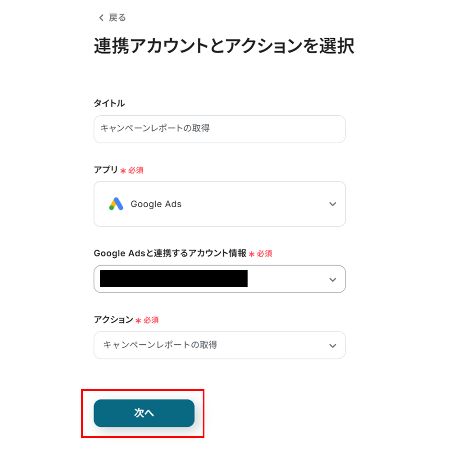 (2)Google Adsの「連携アカウントとアクションを選択」画面から、Google Adsと連携するアカウント情報に誤りがないかを確認し、アクションは「キャンペーンレポートの取得」のままで「次へ」をクリックします。