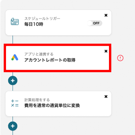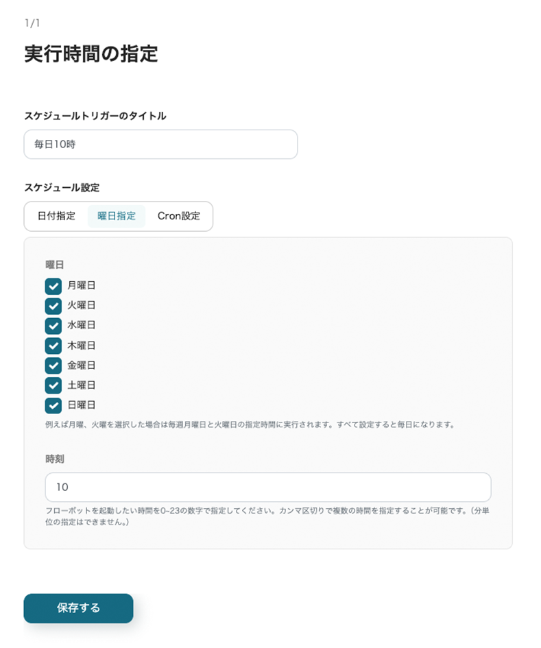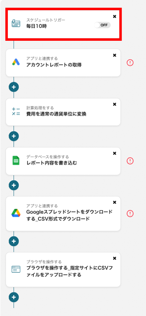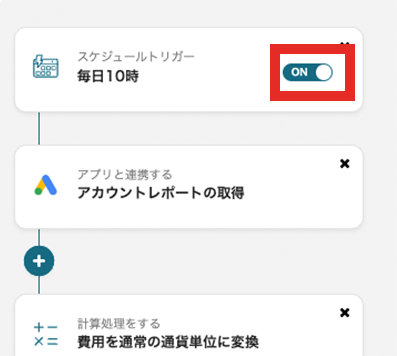 スケジュールトリガーのタイトル→デフォルトで毎朝10時に設定されています。任意の名称に変更できます。