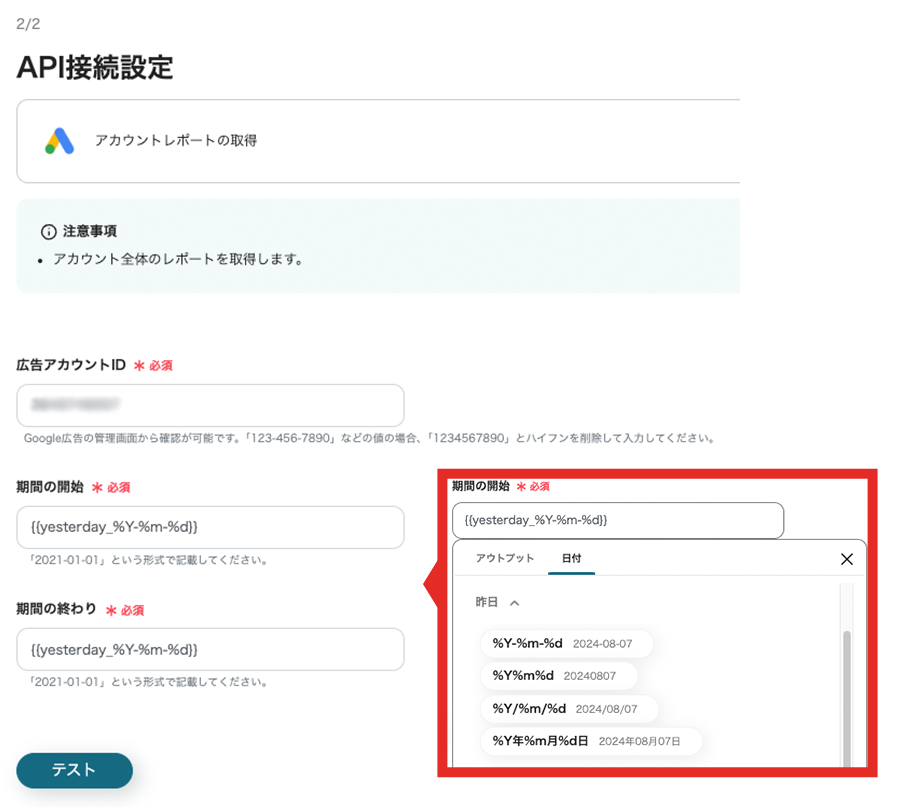 広告アカウントID→Google広告の管理画面から確認が可能です。「123-456-7890」などの値の場合、「1234567890」とハイフンを削除して入力してください。
