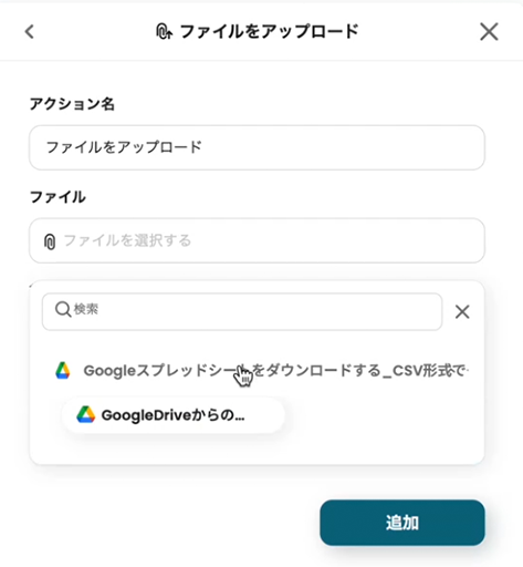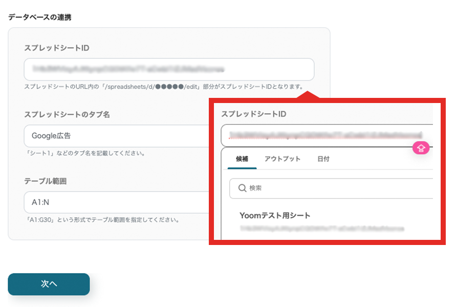 ファイルID→連携したGoogle スプレッドシートのIDを入力します。編集欄をクリックで候補が表示されるので、選択します。