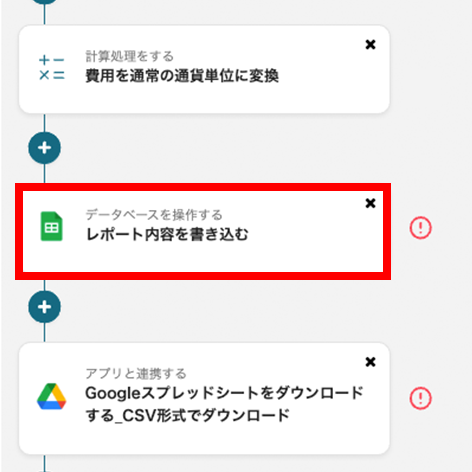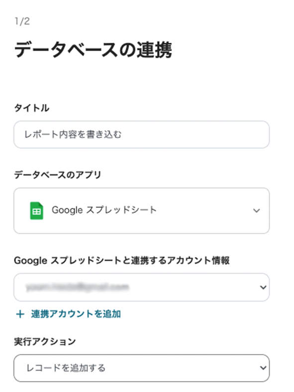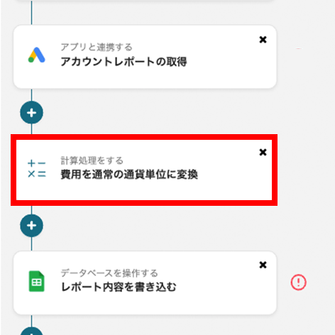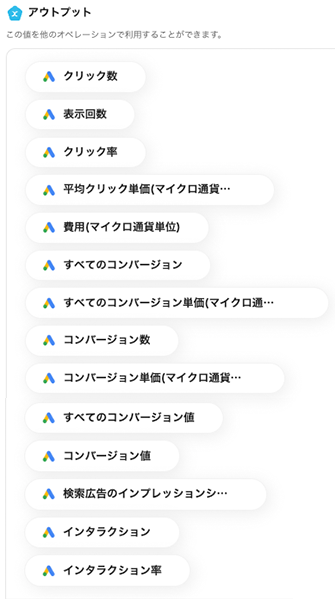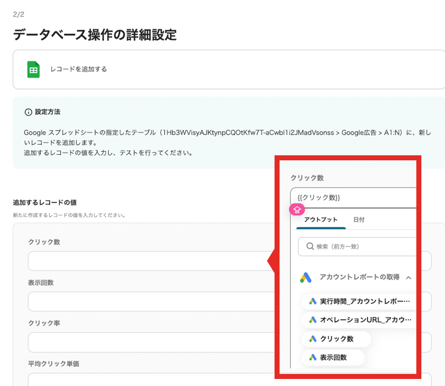 連携したデータベースが読み込まれ、編集欄が儲けられます。それぞれにどの値を蓄積していくか紐付けを行います。各項目の編集欄をクリックで、Google Adsから抽出したアウトプットが表示されます。事前に作成するスプレッドシートの項目名をアウトプットに合わせておくと紐付ける時に素早くできます。