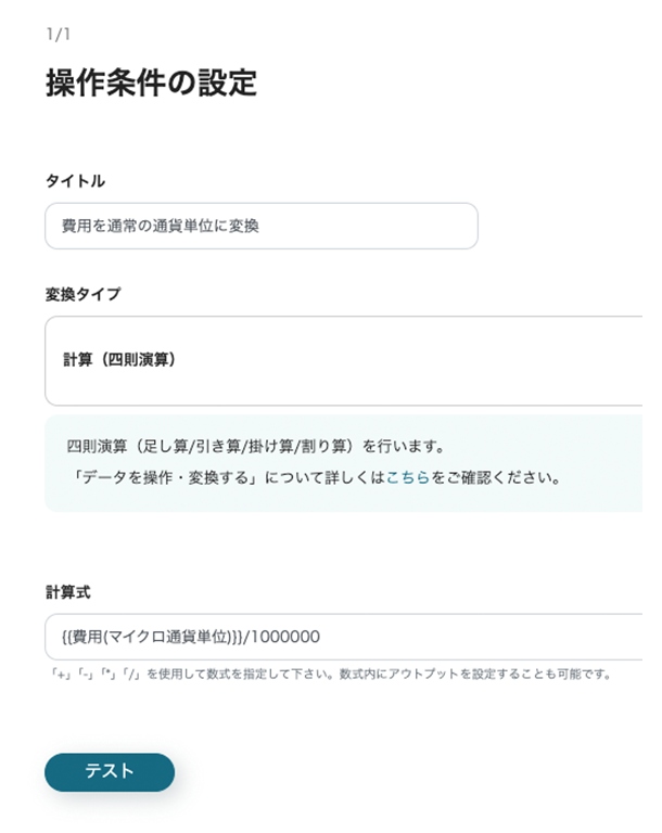 計算式→デフォルトで {{費用(マイクロ通貨単位)}}/1000000 に設定されています。(変更可能)
