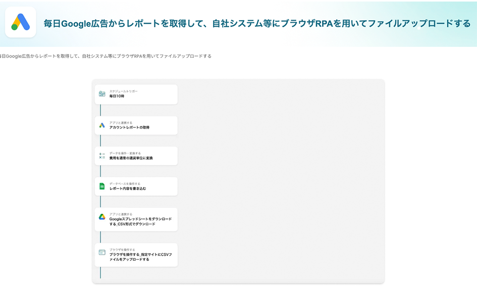 次のセクションから、「毎日Google広告からレポートを取得して、自社システム等にブラウザRPAを用いてファイルアップロードする」フローボットの作り方をYoomのテンプレートを用いてご紹介します。