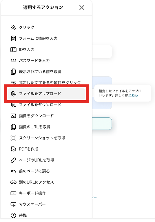 >ヘルプ ブラウザ操作:「ファイルをアップロード」アクションについて