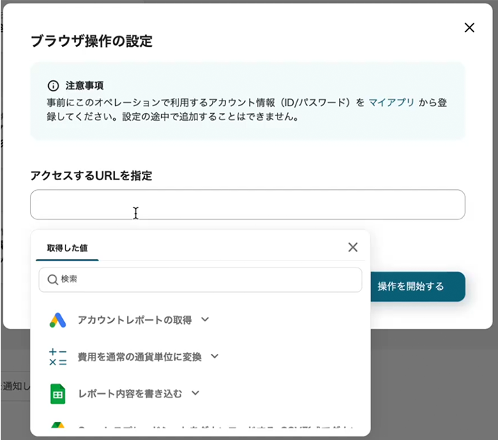 ブラウザを操作するオペレーションは5つの操作を組み合わせて設定します。