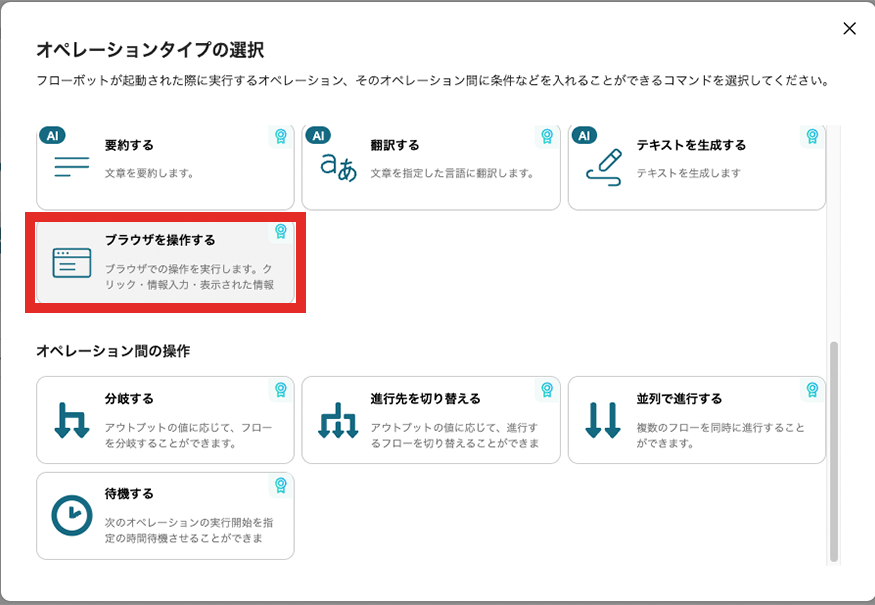 オペレーションタイプの中から、ブラウザを操作するを選択します。