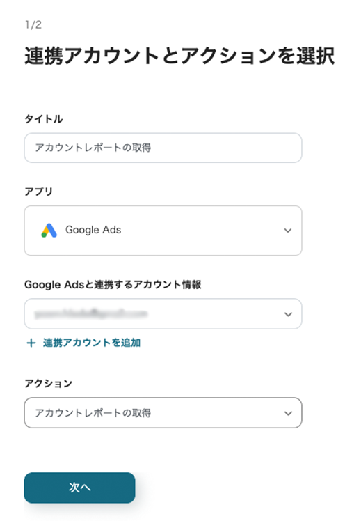 Google Adsと連携するアカウント情報→「+連携アカウントの追加」をクリック。ログインするアカウントを選び、Yoomへの許可を進めます。
