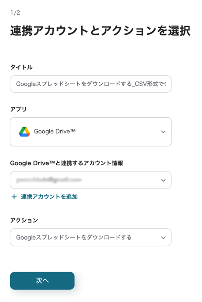 Google Driveと連携するアカウント情報→「+連携アカウントの追加」をクリック。ログインするアカウントを選び、Yoomへの許可を進めます。