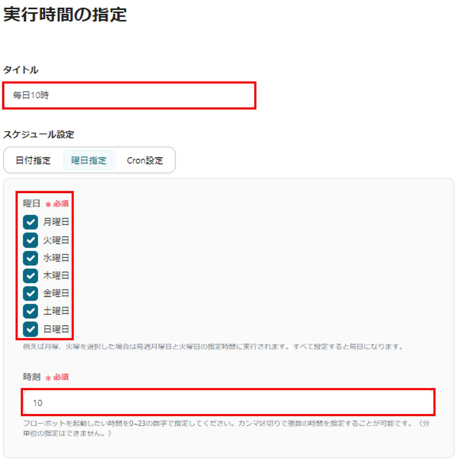※スケジュール設定については、スケジュールトリガーの設定方法を参考にしてください。
