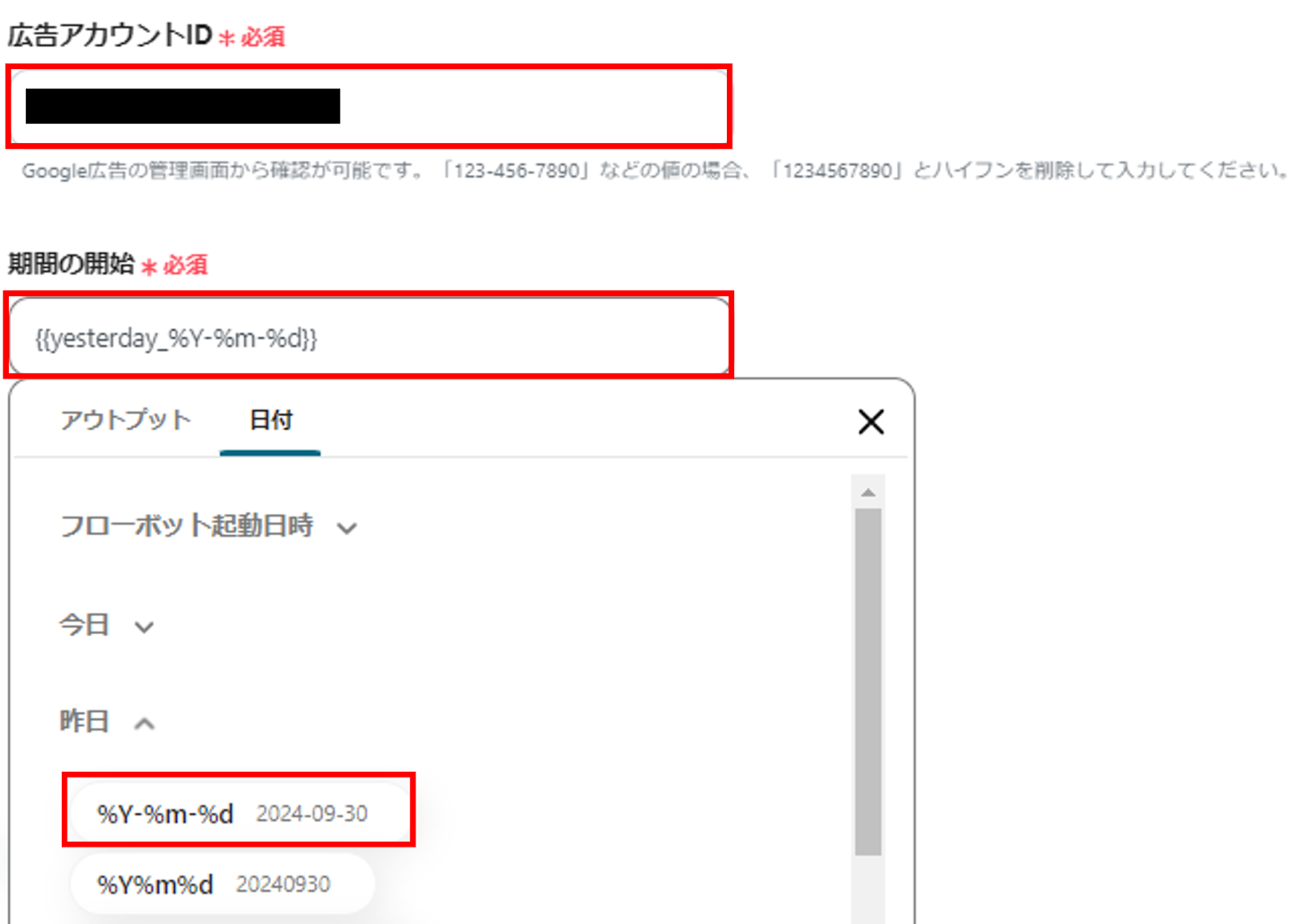 (3)API接続設定画面で、広告アカウントID、期間の開始・終わりを設定します。