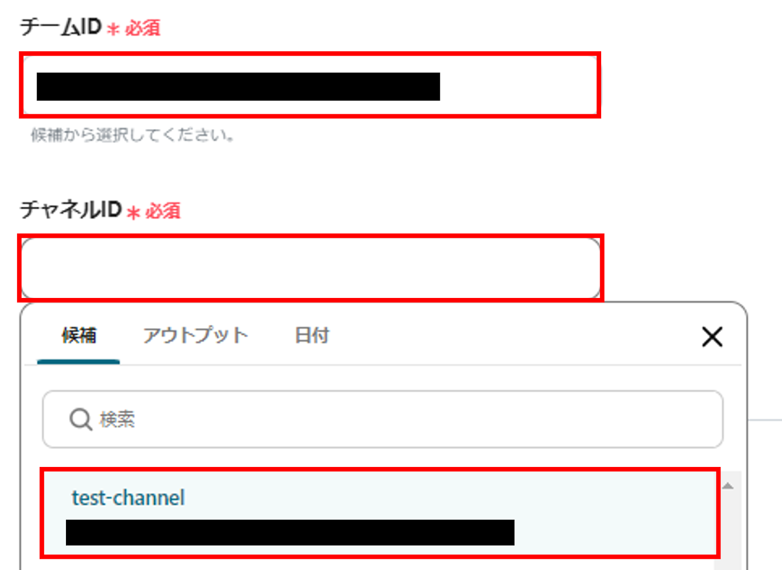 (11)API接続設定画面で、必須項目を設定します。チームIDとチャネルIDは、入力欄をクリックすると候補が表示されるので、その中から該当するものを選択してください。